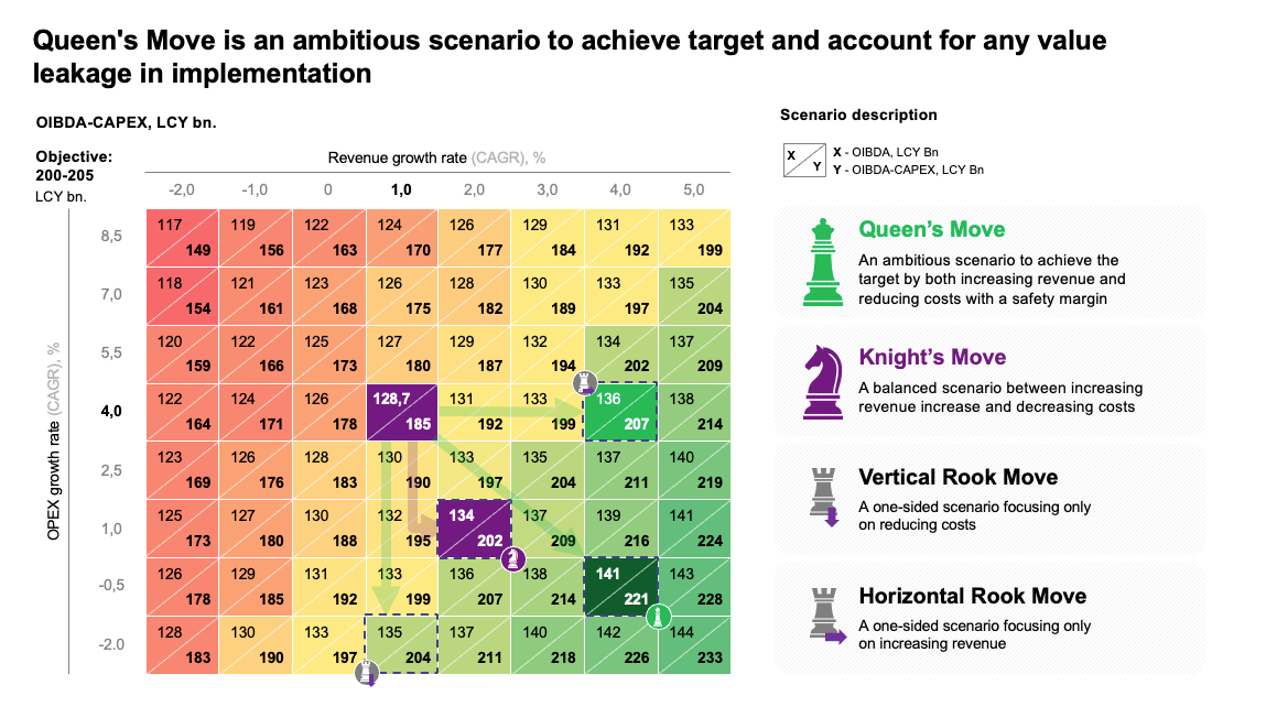 We drew a chessboard grid on a slide. The X-axis represented growth in revenue, and the Y-axis represented cost reduction. The cells represented the financial outcome, depending on X and Y inputs.
