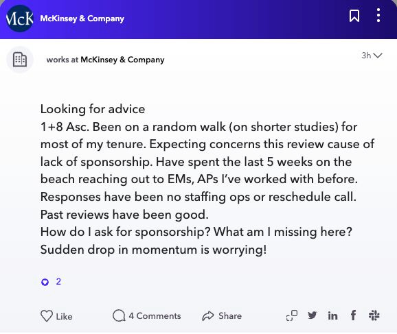 Here’s just one example of this situation. I took this screenshot from a Fishbowl platform where consultants anonymously share their struggles and ask questions.