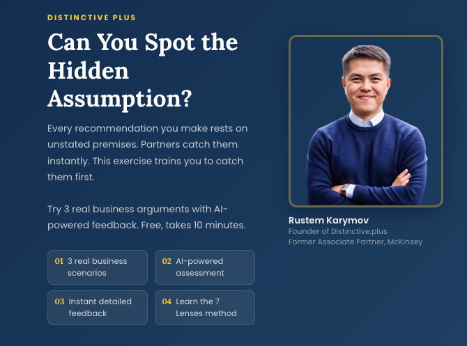 For this reason, I built an interactive exercise for MBB consultants to practice spotting implicit assumptions and strengthen their critical thinking.