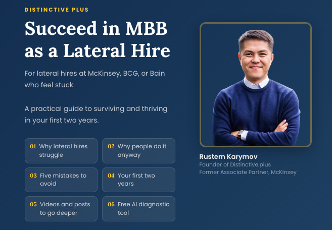 If this is how you feel in MBB as a lateral hire and you want to improve your chances of success, I wrote a free guide on How to Succeed in MBB as a Lateral Hire.